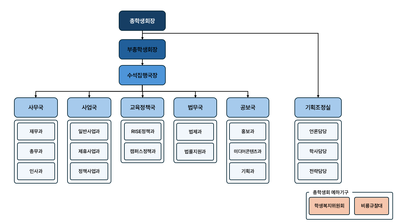사무국은 총학생회의 운영을 담당하고 있으며 총무과, 인사과, 재무과로 구성되어 있습니다.